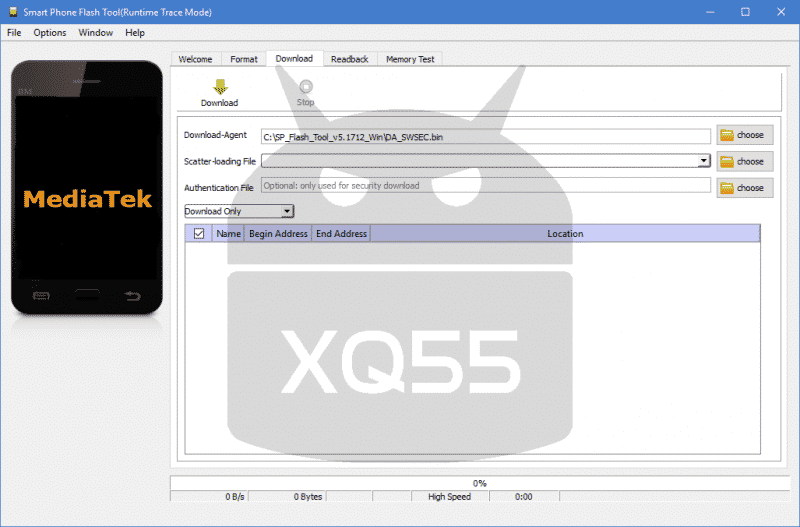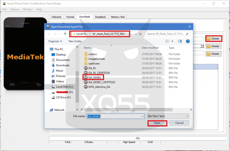 في خانة Download agent اضغط على Choose ستظر لك نافذة اختيار ملف، اختار الملف DA_SWSEC بصيغة bin الموجود داخل مجلد SP Flash Tool كما هو مبين المبين في الصورة