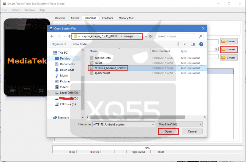 ثم في خانة Scatter-loading file اضغط على Choose ستظر لك نافذة اختيار ملف، اذهب لمجلد الروم، ستجد بداخله ستجد مجلد باسم images ادخل عليه واختار الملف MT8173_Android_scatter بصيغة TXT كما هو موضح