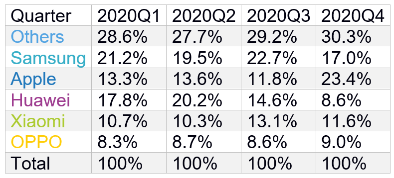 ملاحظة4: حتى مع الحرب على هواوي لم تتراجع هواوي كثيرا في عام 2020 والرقم تغير للأقل في 2021.
