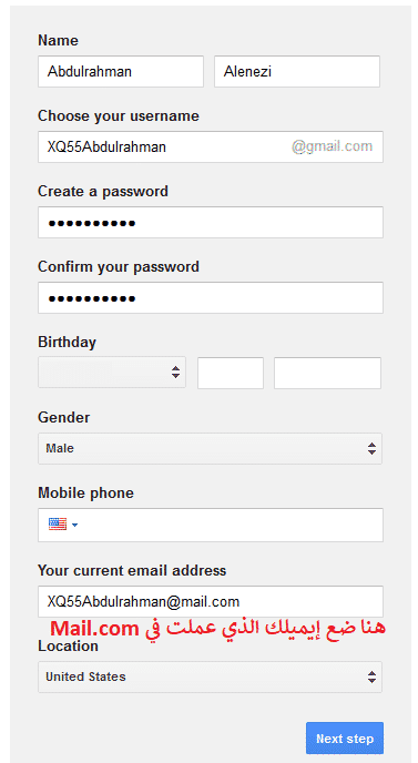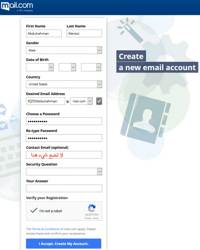 سابعا اذهب لموقع Mail.com واعمل إيميل خاص بك والدولة أمريكا: