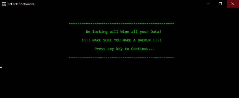 هذه الخطوة اختيارية لإغلاق البوتلودر، وصل الجهاز من جديد في الكمبيوتر وهو يعمل على النظام، شغل الاداة واضغط على رقم 2 ثم أنتر لأختيار قائمة Unlock – ReLock Bootloader ثم اضغط على رقم 2 لأختيار ReLock Bootloader. الأن سيقوم بإغلاق البوتلودر وعمل مسح كامل لبياناتك.
