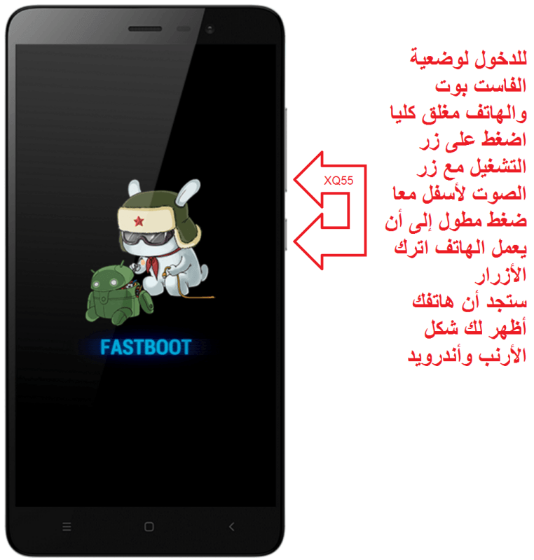 والهاتف مغلق كليا قم بالضغط على زر التغشيل مع زر الصوت لأفل معا حتى تجد أن الجهاز اشتغل تترك الأزرار ستجد كلمة فاست بوت