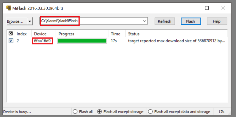إذا وجدت كلمات وأحرف تحت Device يعني أن Mi Flash تعرف على هاتفك وأنت جاهز