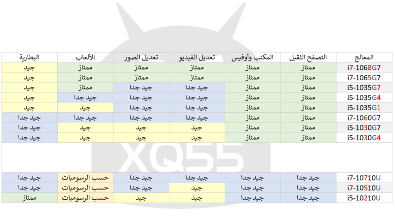 ** اعتبار الجدول التالي على أساس أن المعالج من الجيل الثامن على الأقل.