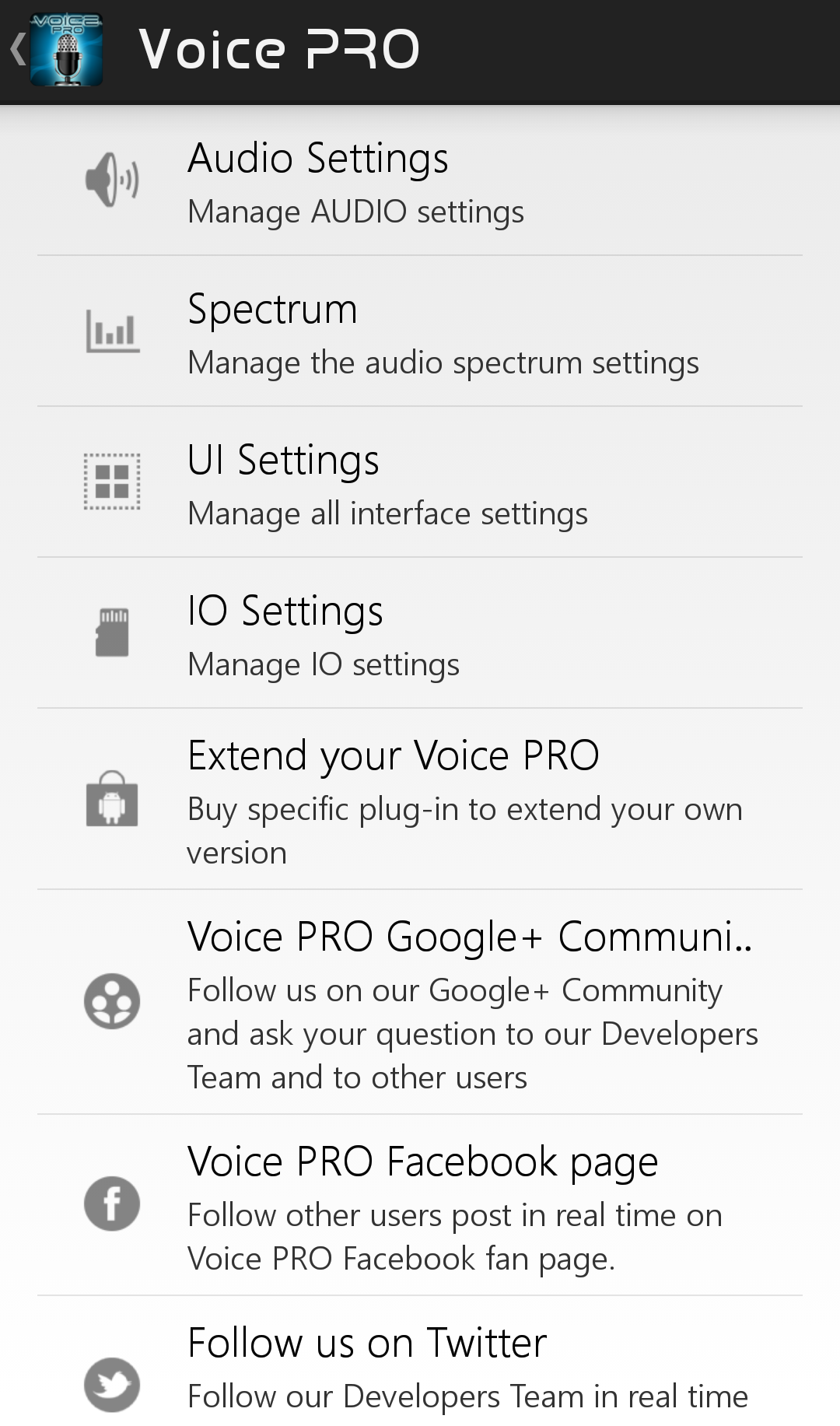 لعل واحد من افضل تطبيقات تسجيل الصوت هو Voice Pro، يمكنه تعديل الصوت بعدة ادوات، يمكنه تسجيل الصوت باكثر من 80 صيغة ( 83 صيغة بالضبط الى لحظة كتابة هذه التدوينة )، يمكنه دمج مجموعة اصوات معاً، ويمكنه ايضاً ازالة الكلام ( تجريبي )، يمكنه ضبط ربح الصوت في الوقت اللحظي، يمكنه ايضاً استيراد المقاطع من يوتيوب وغيرها من المميزات التي تركنا لك متعة اكتشافها بنفسك.