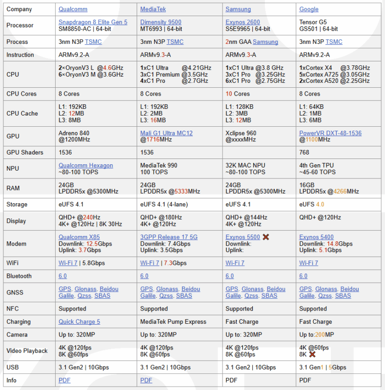 Qualcomm Snapdragon 8 Elite Gen 5 vs MediaTek Dimensity 9500 vs Google Tensor G5 vs Samsung Exynos 2600